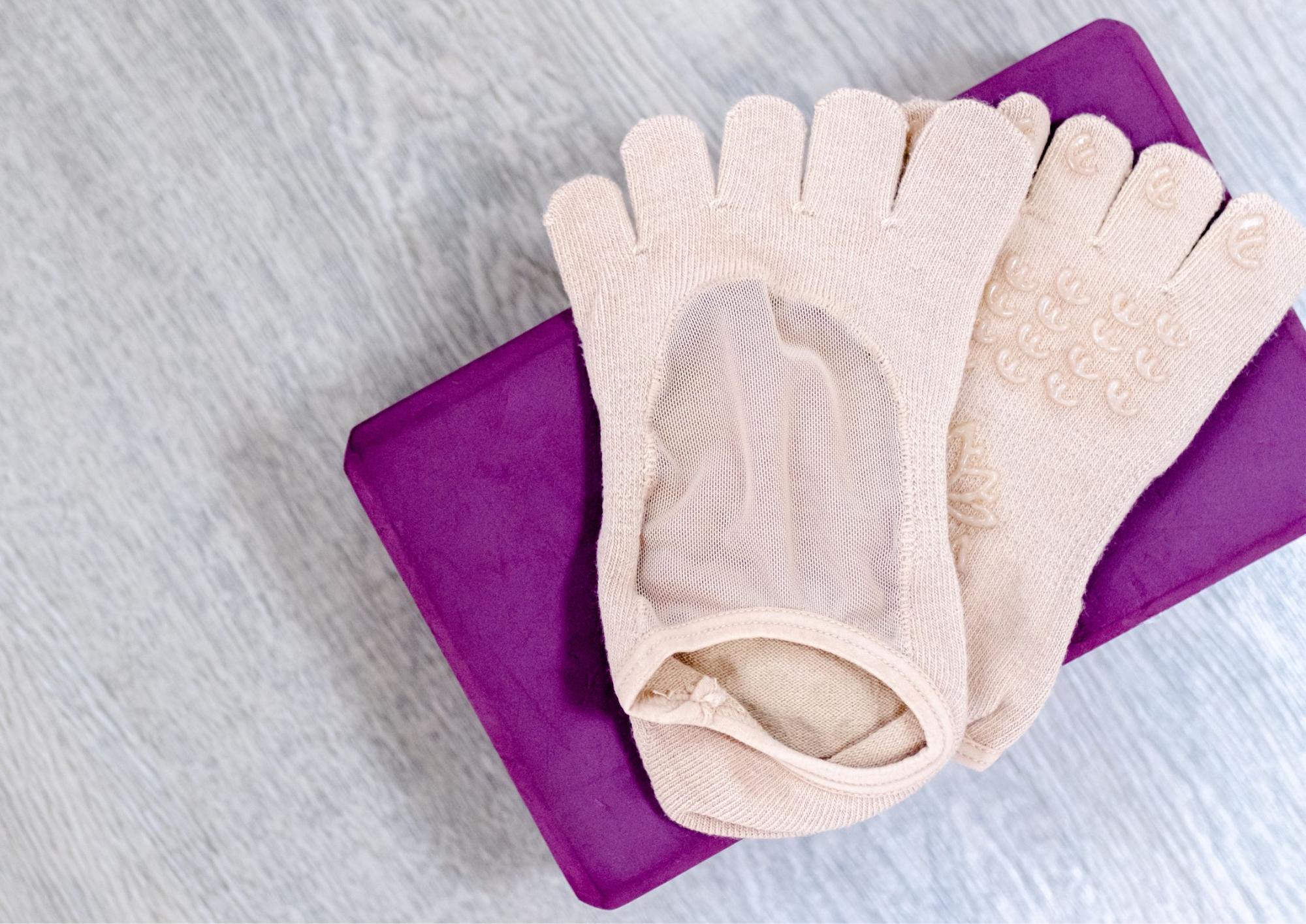 ホットヨガは基本的に裸足で行います。滑りが気になる人は「滑り止め付きのヨガソックス」を使うのもあり。シューズは不要ですが、スタジオへの移動用に通気性のよいスリッパやサンダルを用意しておくと便利です。