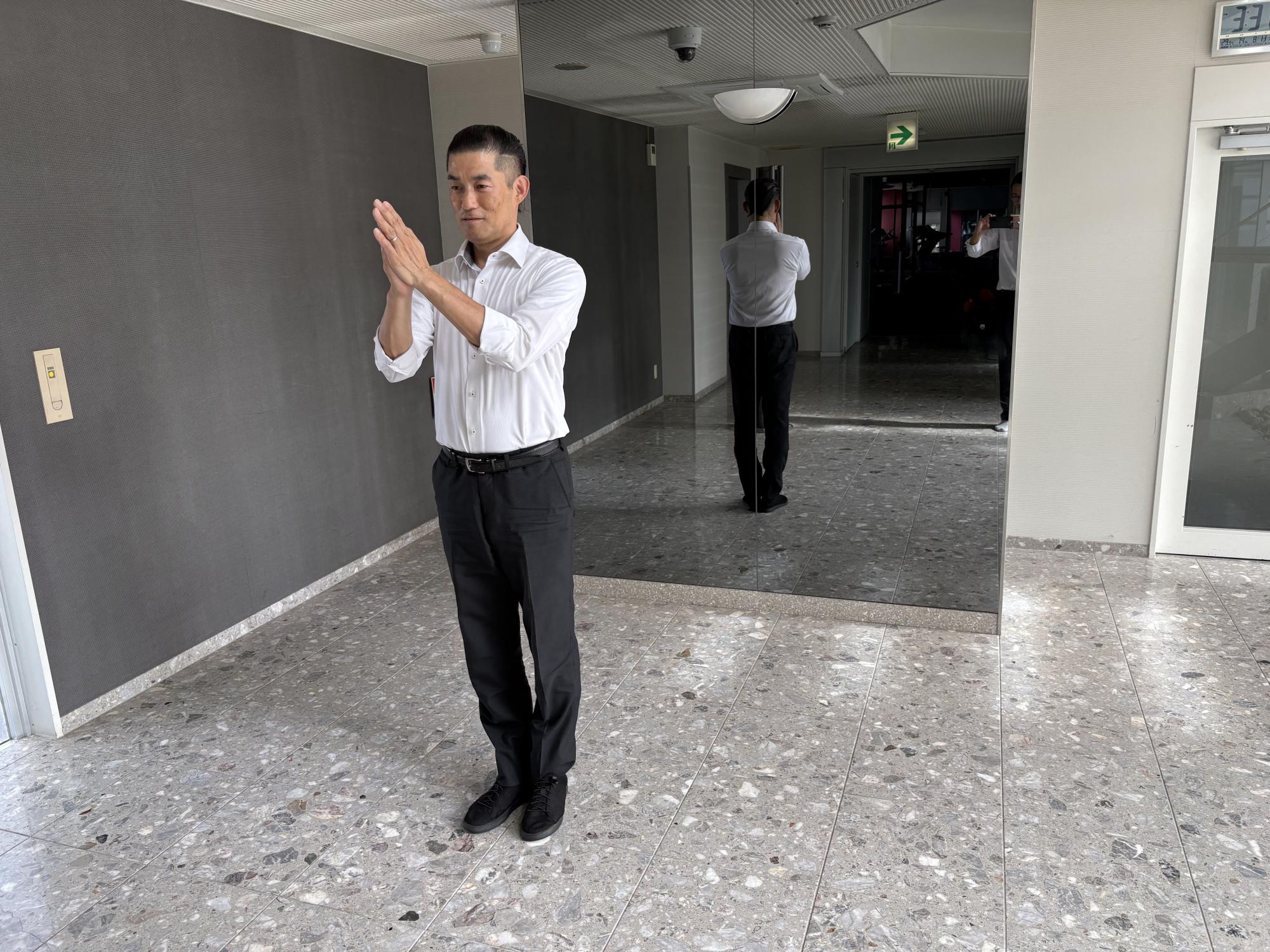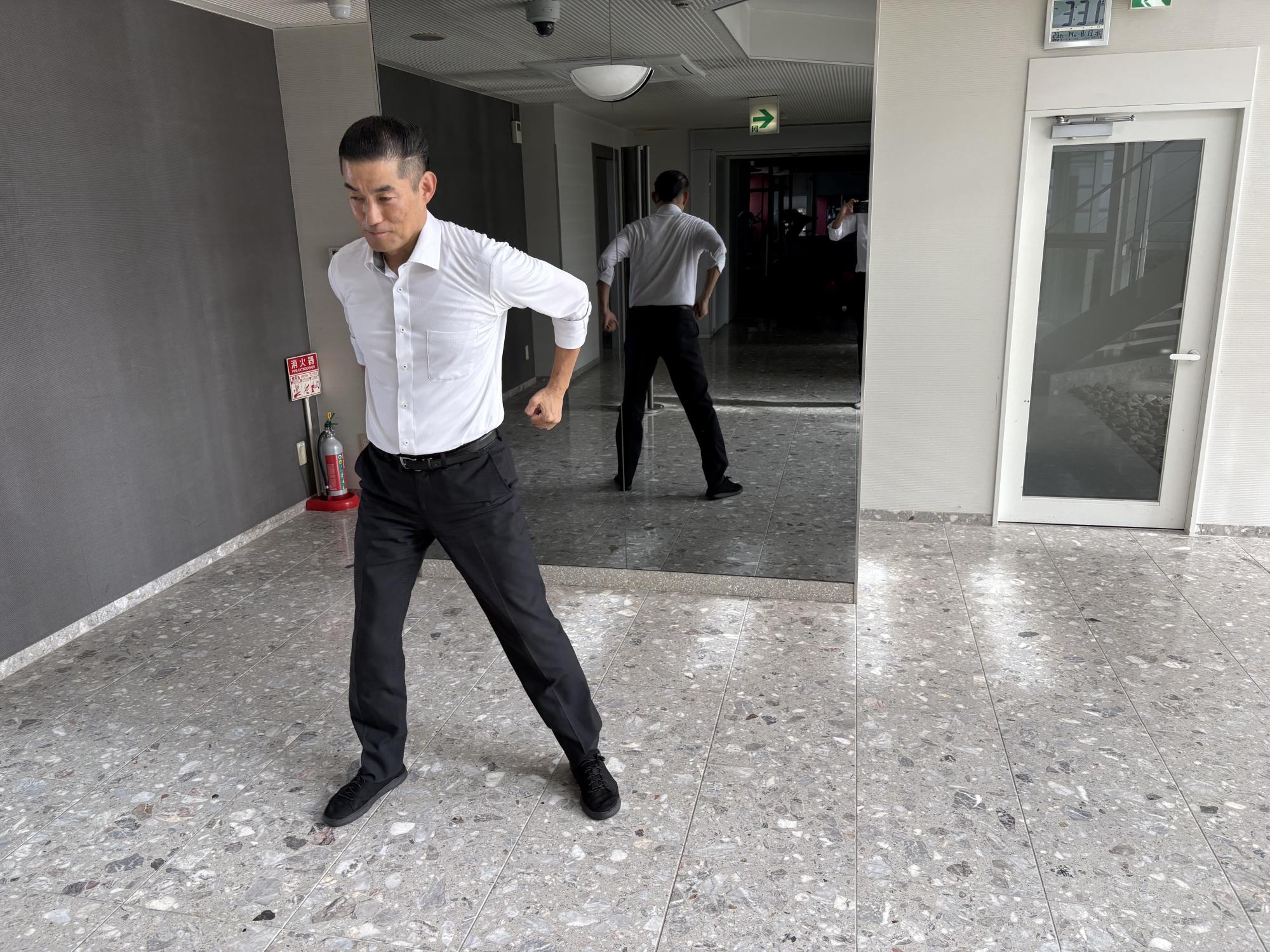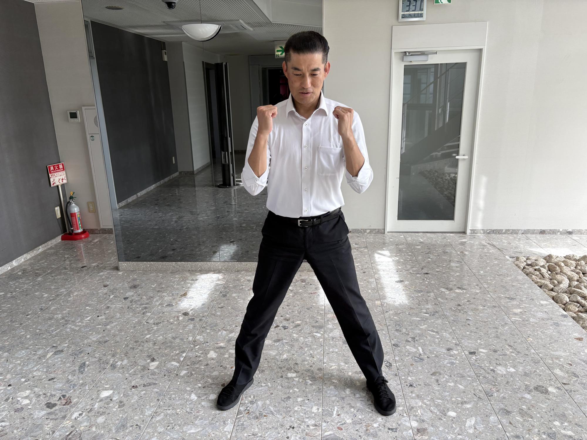 足運びを覚えて上半身の動きも意識できるようになったら、大きく腕を動かしてみましょう。1カウント目は両腕を曲げて脇を締めます。2カウント目に地面に向かって腕を伸ばします。3カウント目に両腕の肘を背中側に突き出し、4カウント目で顔の目の前で手を叩きます。これを一連の動作でできるようになりましょう。