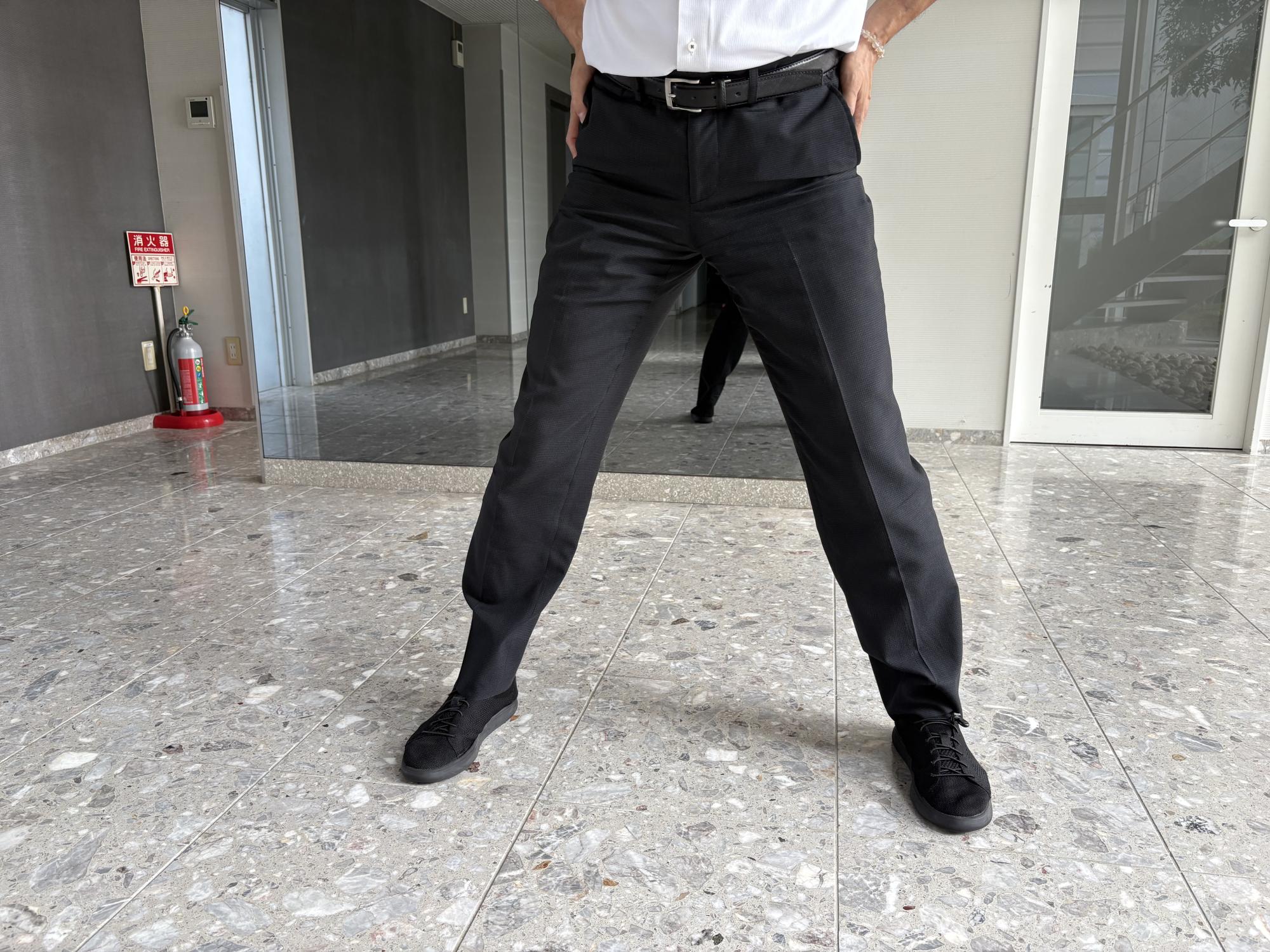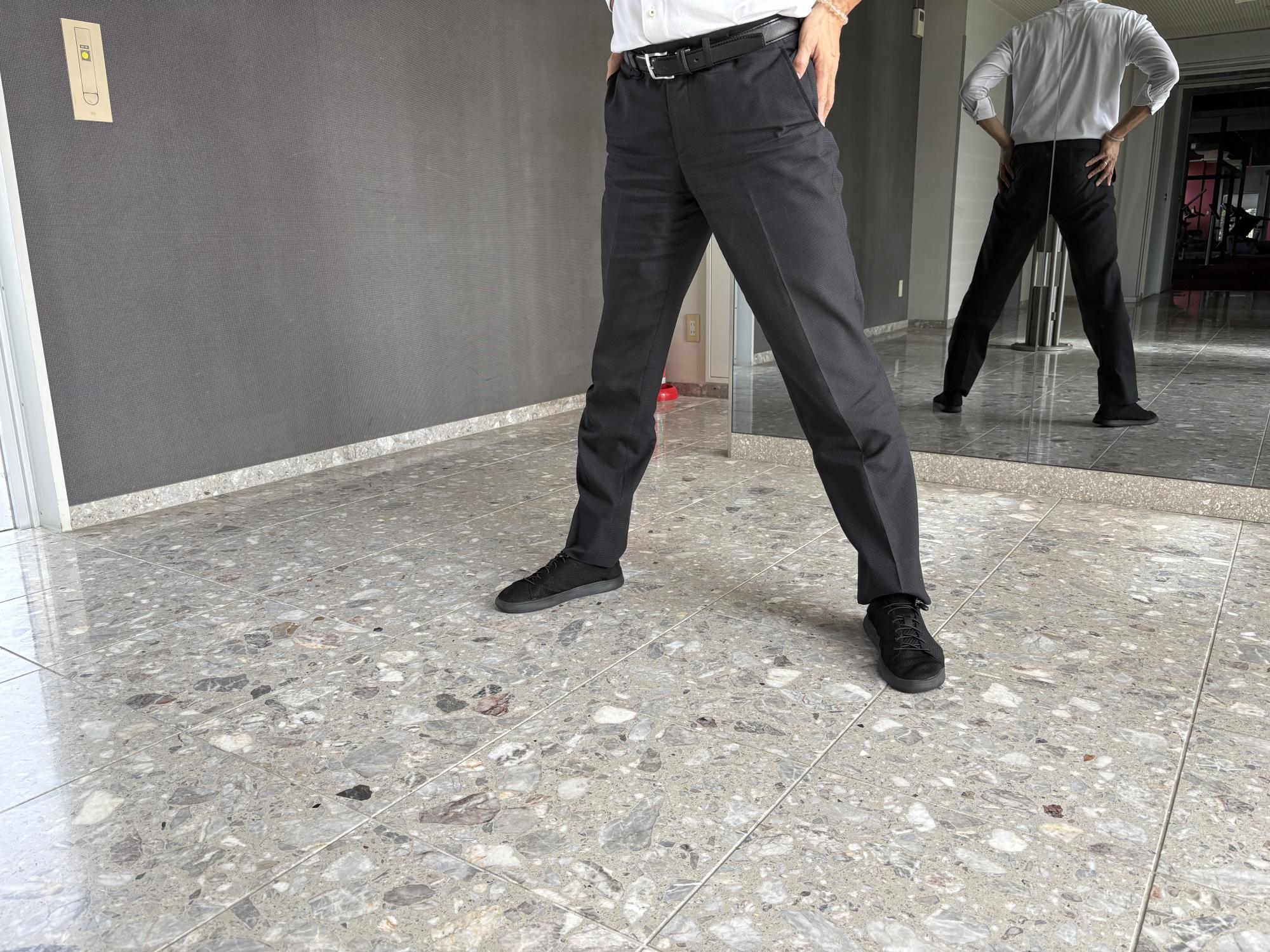 ポイントは、足をクロスさせるときに上半身が前に傾かないようにすること。背筋を伸ばし、視線を正面に保つと安定します。