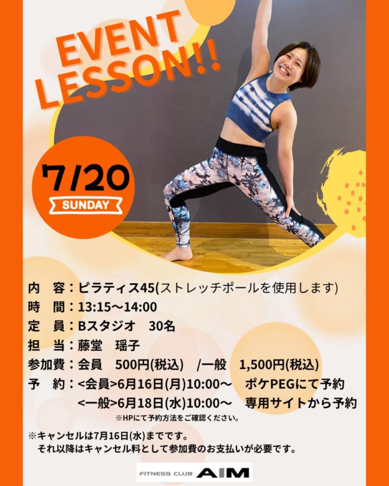 【イベント】7月20日(日) 『ピラティス』イベントレッスン !