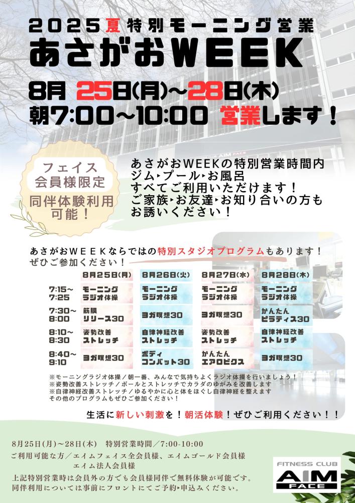 8/25(月)~8/28(木)はあさがおWEEKとして特別に7時から営業いたします。