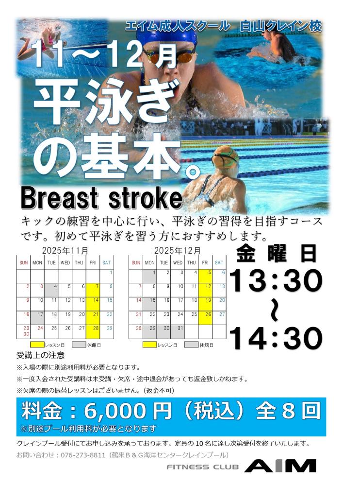 エイム成人スクール11〜12月「平泳ぎの基本」コースの受講者募集開始しました。