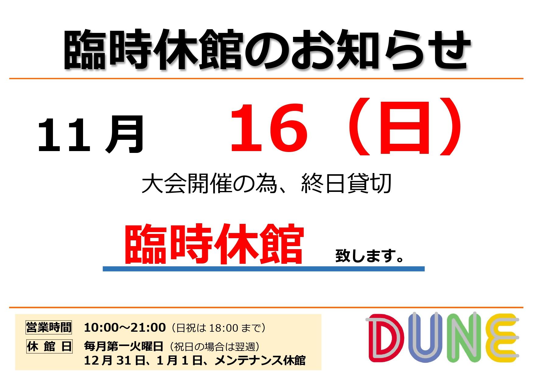 11月16日(日)は大会のため臨時休館とさせていただきます。