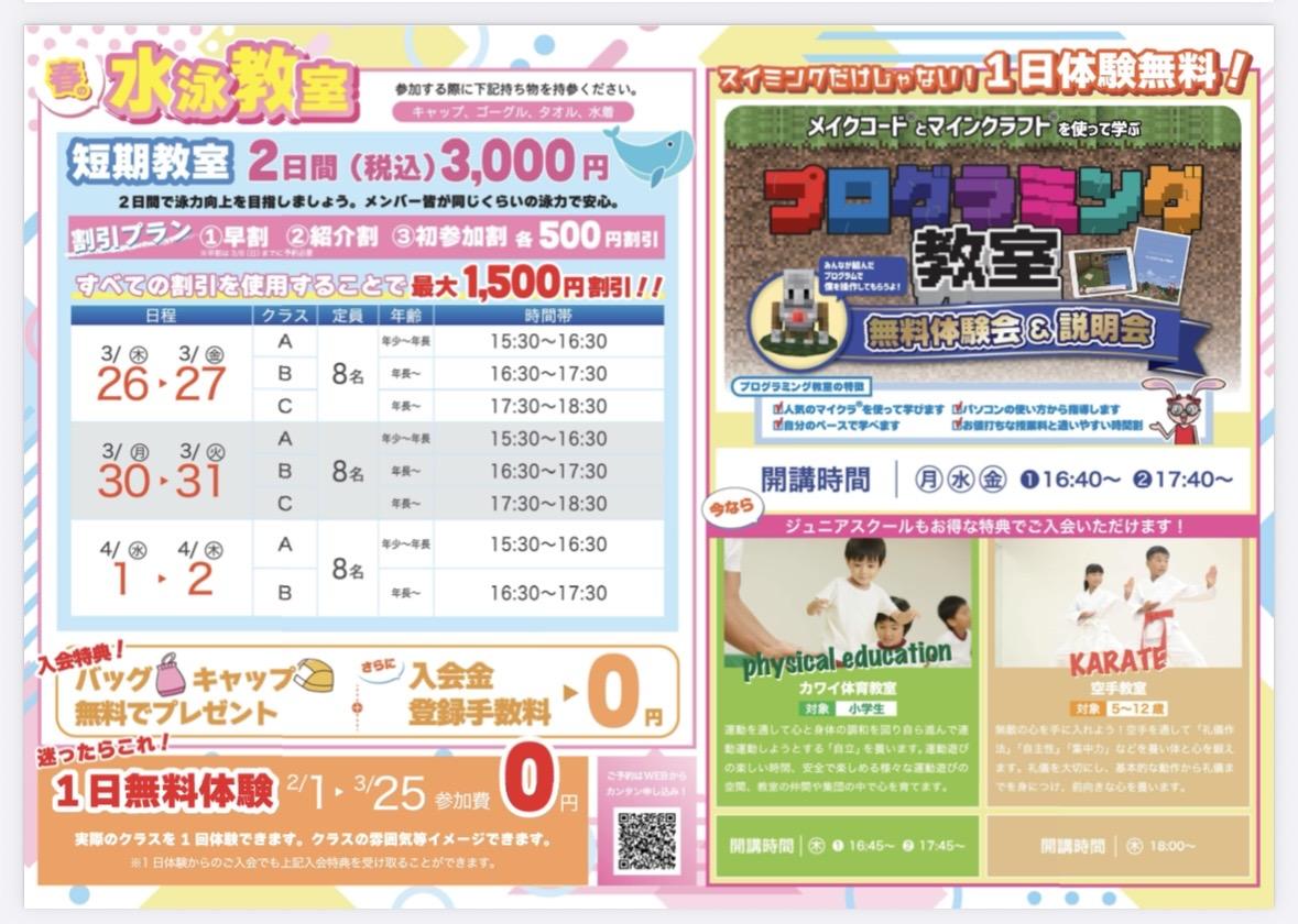 ジュニアスクール春の体験教室申込受付開始しました♪(スイミング・プログラミング・空手・体育教室)
