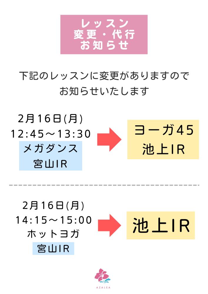 【緊急】 2/16(月)レッスン変更・代行のお知らせ