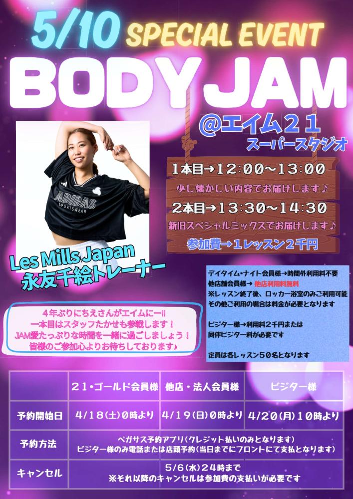 5月10日(日)Les Mills japanより永友千絵トレーナーをお呼びして、BODYJAMスペシャルイベントを開催いたします!