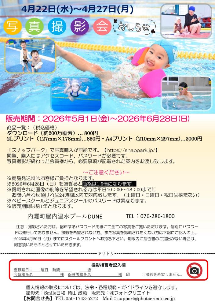毎年恒例の「水中写真撮影会」が4月22日から4月27日にわたって、普段のレッスンに合わせて行われます。
